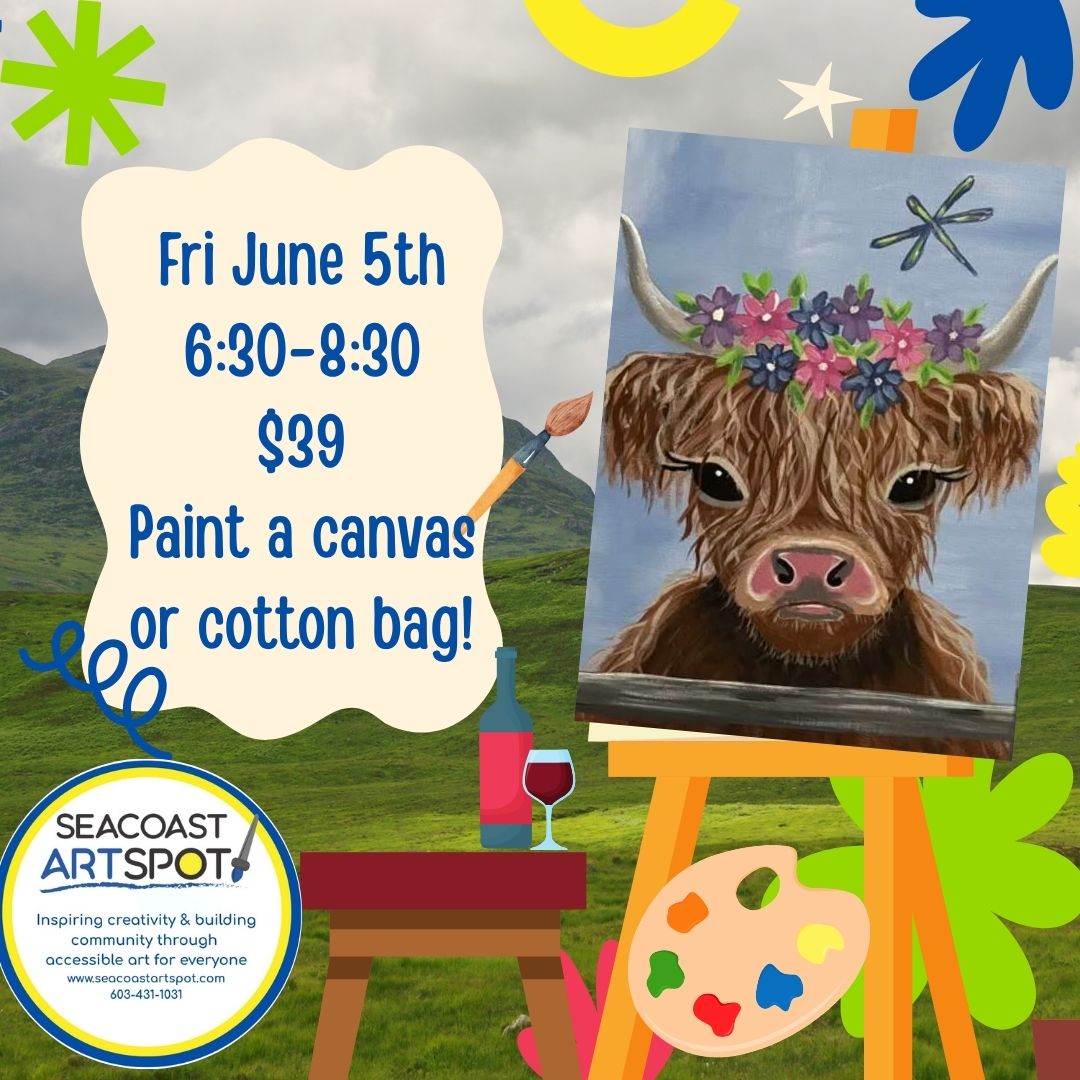 Highland Cow Paint Night! $39 Paint and Sip! Paint a Canvas or Tote Bag