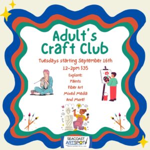 Welcome to Craft Club for Adults! Craft Club is the perfect spot for adults who are looking to connect with others who enjoy creating, wanting to share an afternoon of fun, feeling interested in trying out a new medium, or just needing to get their creative juices flowing! Each week, Emma will have two different materials available to explore; the materials will be beginner friendly and Emma will lead a small instruction about each material and how to use it. Feel free to invite your bestie to join you or plan on meeting some new fun faces here at the Seacoast ArtSpot; a spot for all artists to feel welcome and inspired!