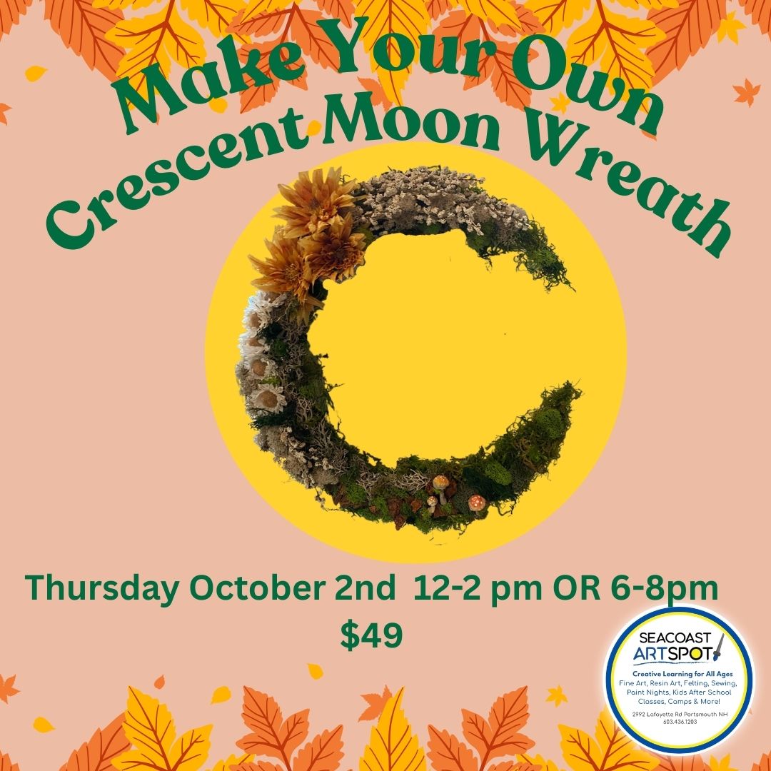 Fall is here at the Seacoast Artspot and so is a new way to make a beautiful autumnal wreath! Join our Fall Wreath Workshop where Emma will lead artists on how to turn a wreath frame into a beautiful crescent moon shape, perfect for welcoming the fall energy into your home! Spend time with your fellow artists as you add beautiful faux flowers and dried moss to your wreath during this Fall Wreath Workshop. Feel free to bring your favorite drinks and snacks to the class.