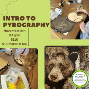 The Seacoast ArtSpot is thrilled to welcome Sara Desjardins into our community! Sara is here to teach our Intro to Pyrography class. Pyrography, also known as wood burning, is the art of creating beautiful images on wood using special heat tools. This wood burning class is perfect for those looking to try a new art form or who have been wanting to experiment with the pyrography medium! Students can expect to learn introduction level techniques as they create a beautiful piece of artwork! Sara will cover wood types and surface preparation, transferring images or freehand sketching, and using a pyrography tool for shading and texture.