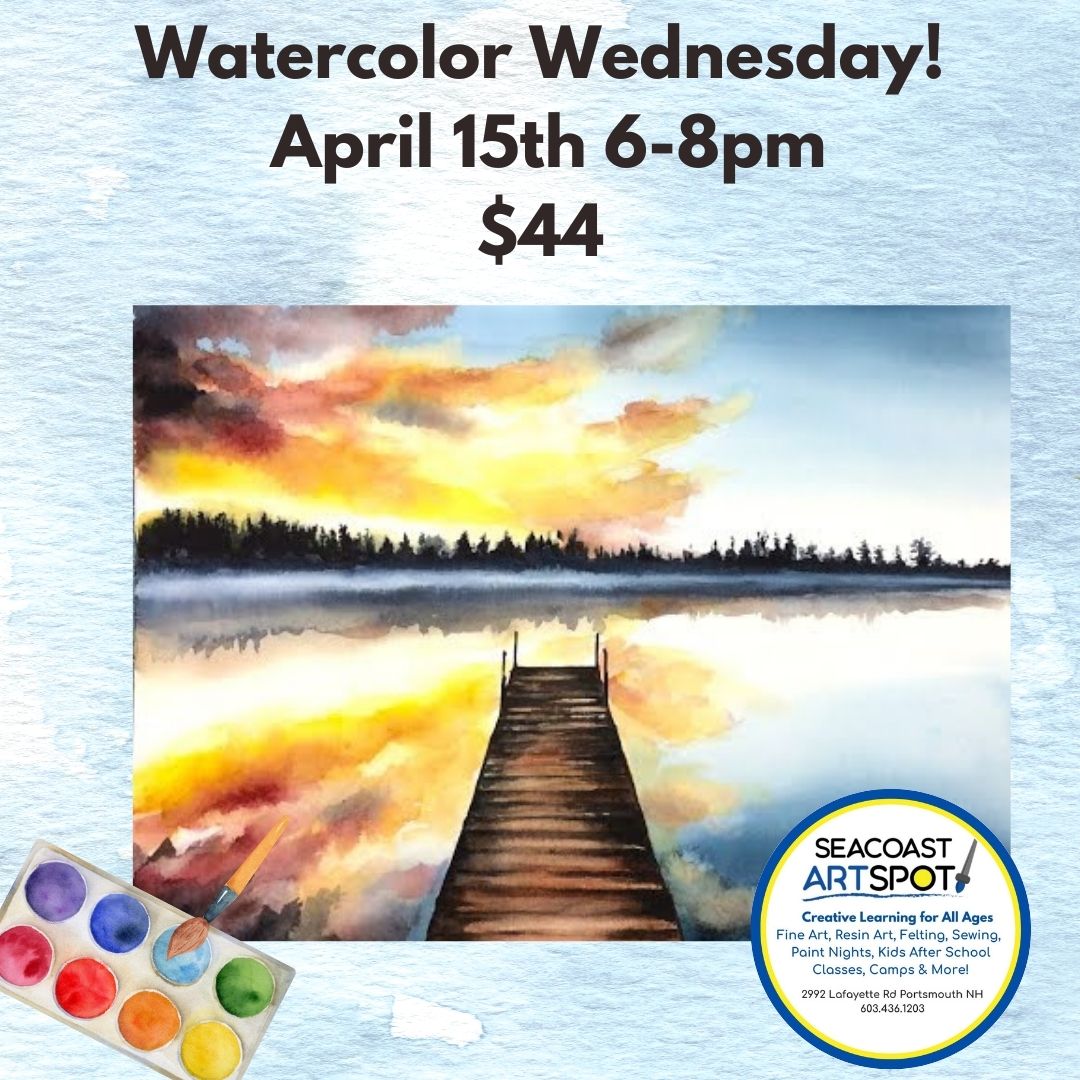 Join us for Watercolor Wednesday and paint a warm, inviting sunset reflecting across a peaceful lake. This beginner-friendly class will guide you step-by-step in creating a glowing sky, soft reflections, and a wooden dock leading into the calm water.